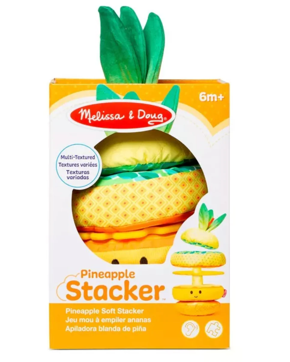 Despierta la curiosidad y el desarrollo sensorial de los más pequeños con el Juguete Melissa & Doug Apiladora Blanda De Piña Y Diversión. Este juguete está diseñado para ofrecer una experiencia táctil y visualmente estimulante, con una base en forma de piña y múltiples piezas para apilar. Incluye 1 anillo de plástico y 3 anillos de tela con diferentes texturas que al ser presionados emiten sonidos crujientes. La parte superior de la piña cuenta con hojas texturizadas, ideales para la estimulación sensorial y el desarrollo de habilidades motrices finas.